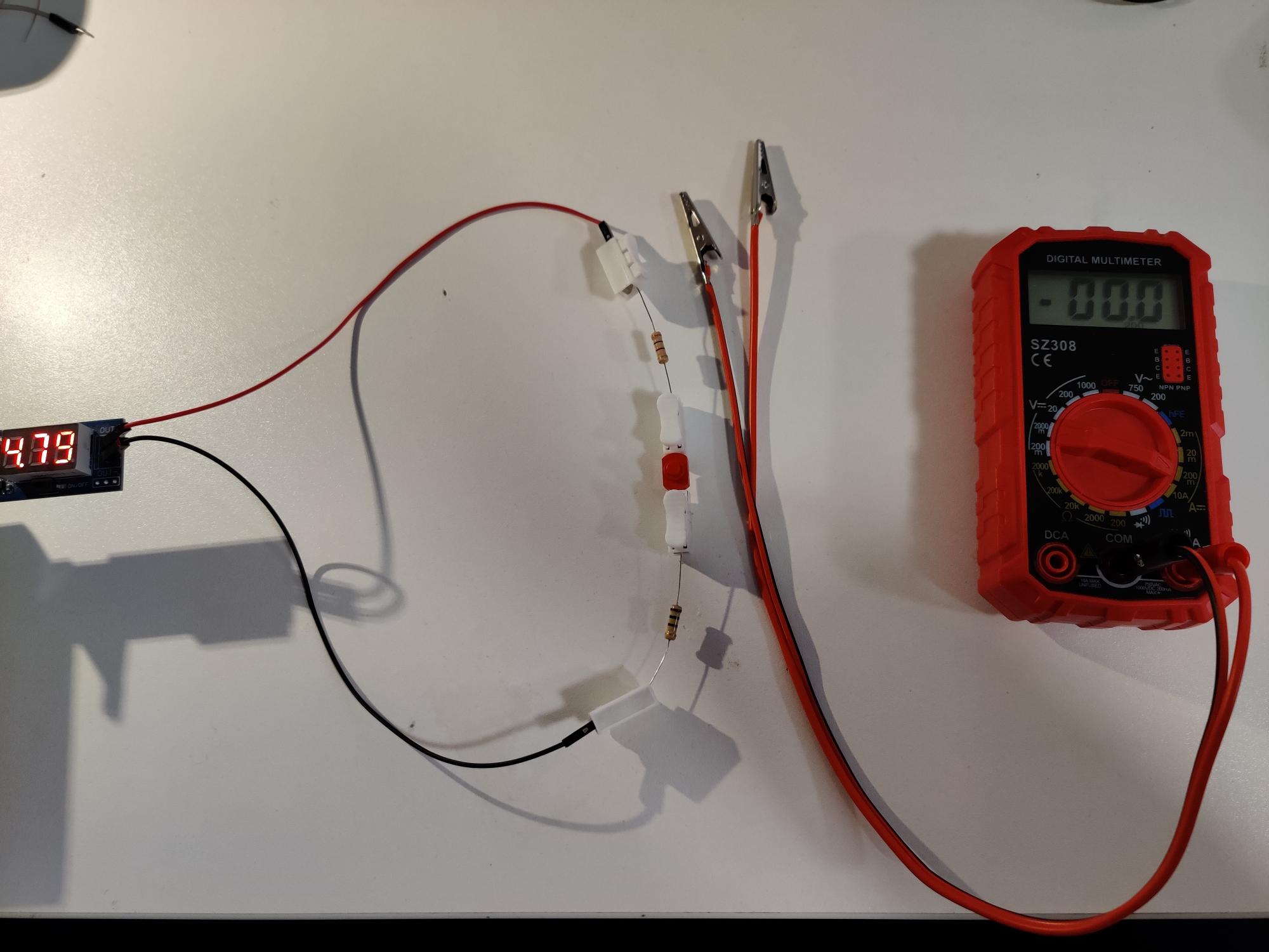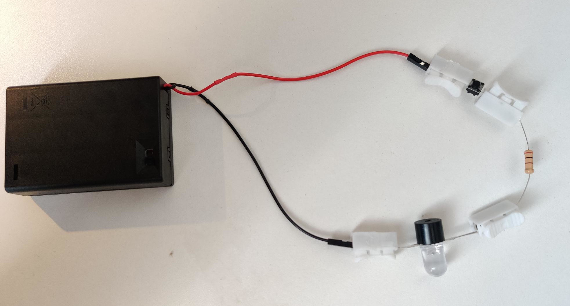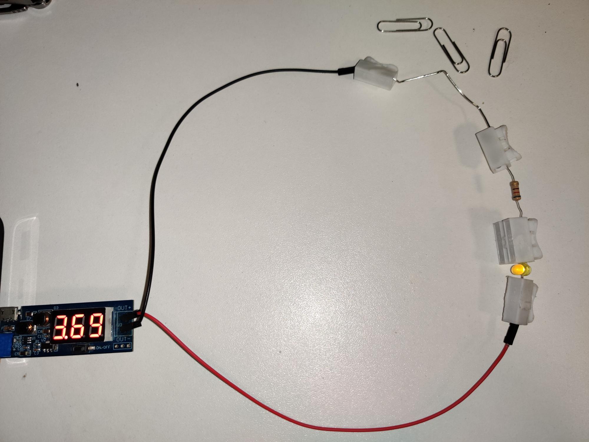 Підключіть послідовно: джерело живлення 4.5В, кнопку, 2 резистори 100 Ом.