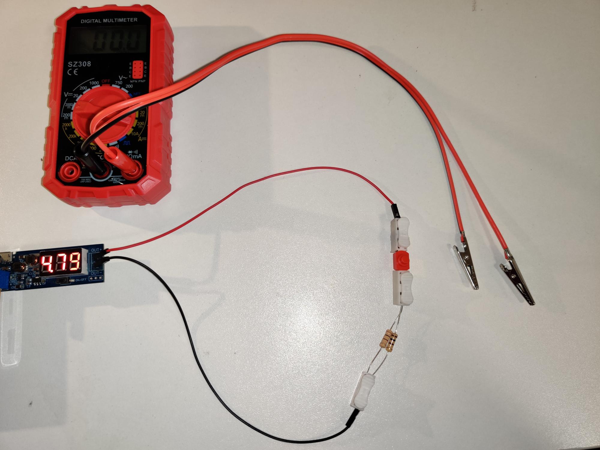 Підключаємо 100 Ом резистор в коло з джерелом живлення. Вистав ляємо 6В на джерелі живлення. Резистор має стати гарячим на дотик, але ще не обпікати.