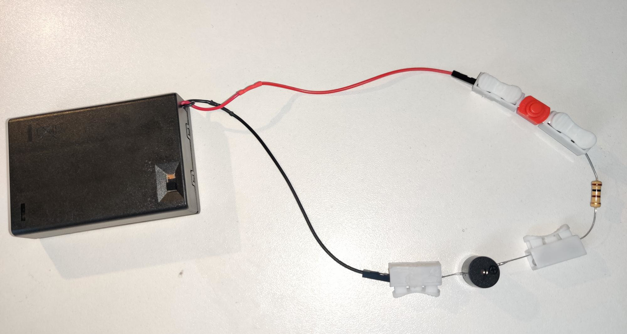 Підключіть джерело живлення до динаміка через 100 Ом резистор. Можете додати червону кнопку як на фото або чорну.