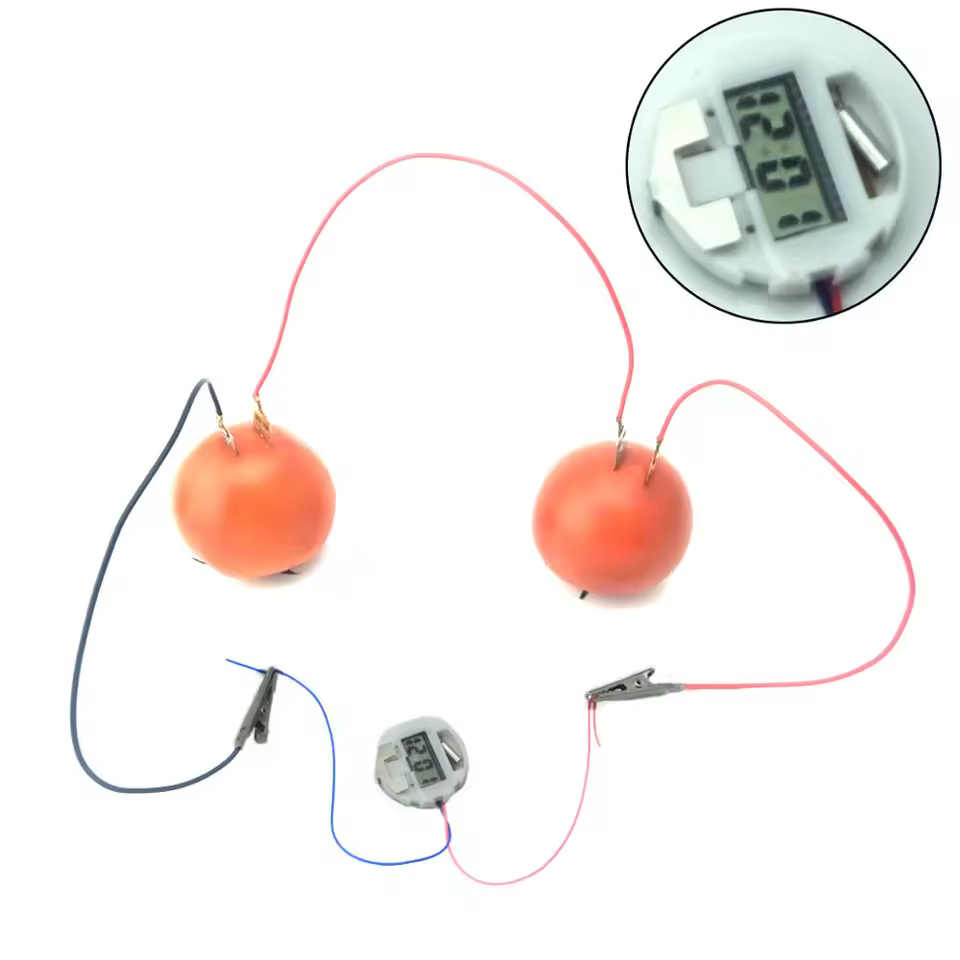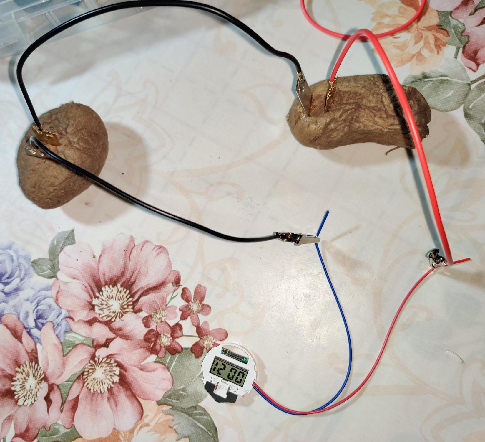 Створюємо батарейку з мідних і цинкових пластин та картоплі. Для того, щоб заживити е лектронний годинник потрібно не більше 2 картоплин. Якщо хочете заживити світлодіод, то вже знадобиться 4 картоплини