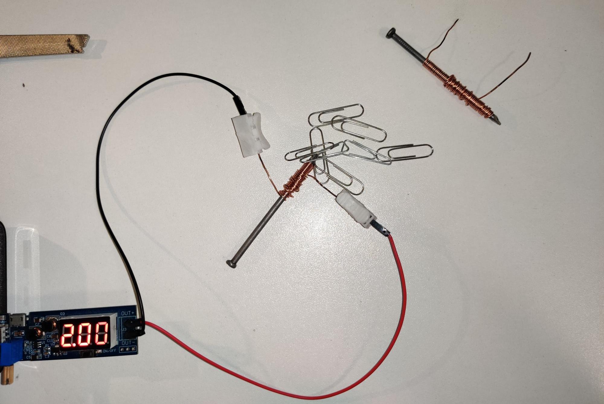 Намотайте ізольований емальований мідний дріт на 2 цвяхи. На одному близько — 20-ти, на іншому — близько 50 мотків. Оскільки дріт емальований, то щоб його можна було підключити до джерела живлення треба 2 кінці намотаного дроту підвалити і зашкурити (зняти шар емалі і тим самим оголити дріт). Підключіть 2 кінці дроту до джерела живлення 2В (можна без реостата/резистора). Перевірте силу кожного вручну зробленого електромагніту на скріпках. Котрий піднімає більше скріпок? Постарайтесь робити перерви між вмиканням кола кожні 30-40 секунд із-за великого нагрівання електричного кола.
