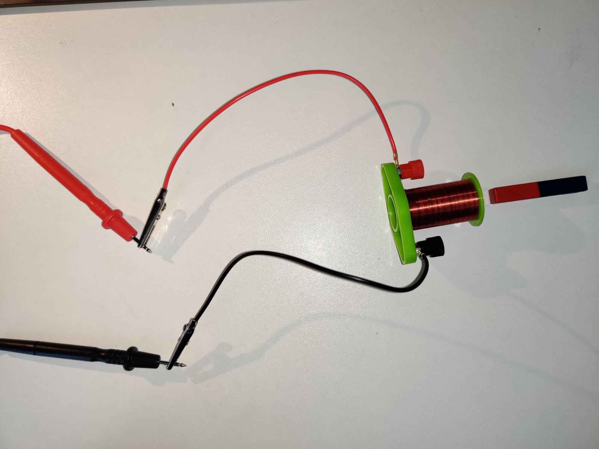 Під'єднайте мультиметр в режимі вимірювання міліампер (як на фото) до широкої котушки з дротом. Швидко вводьте і виводьте магніт в котушку і спостерігайте за показниками мультиметра. Потім переверніть магніт іншою стороною і повторіть експеримент.