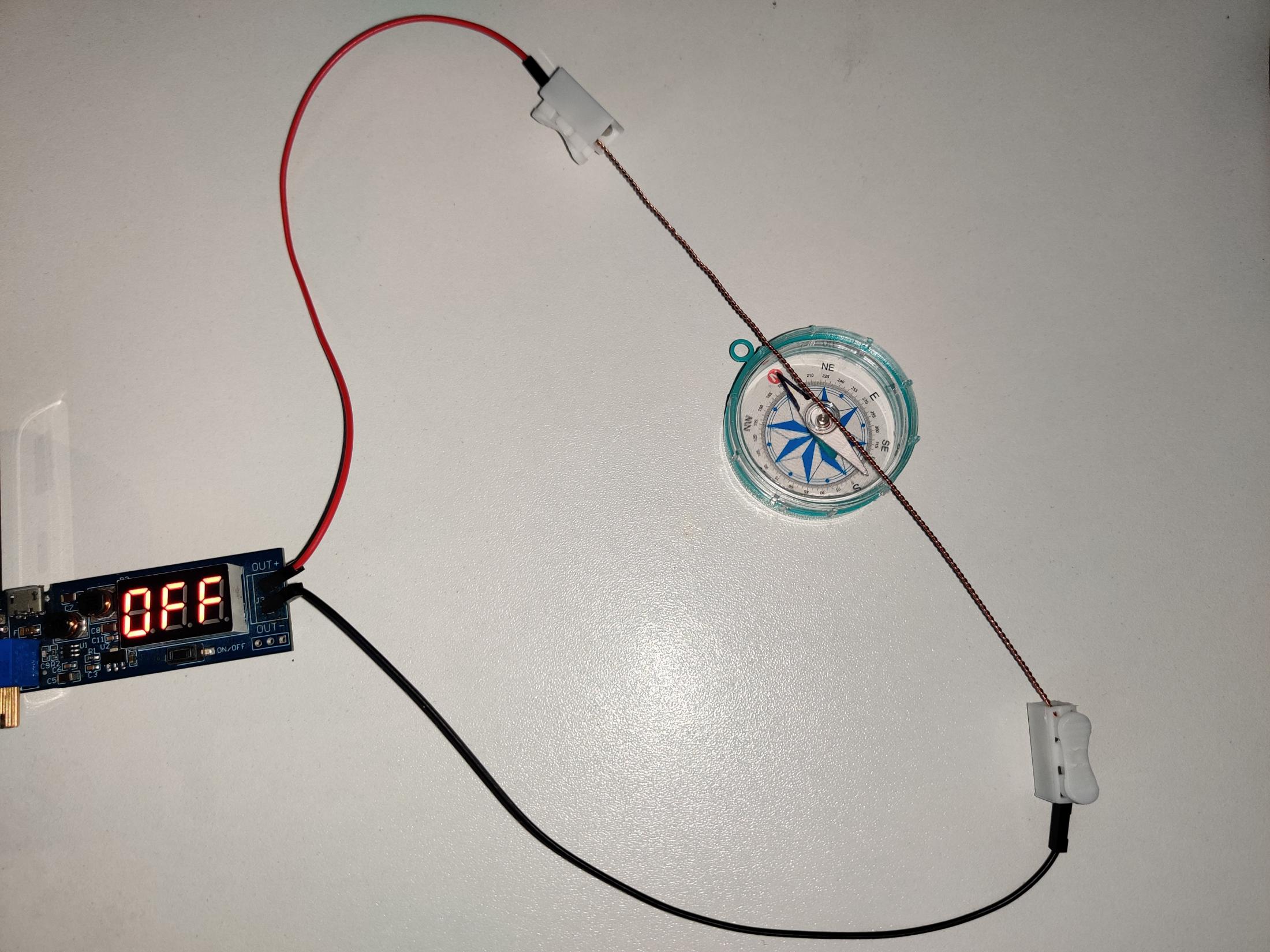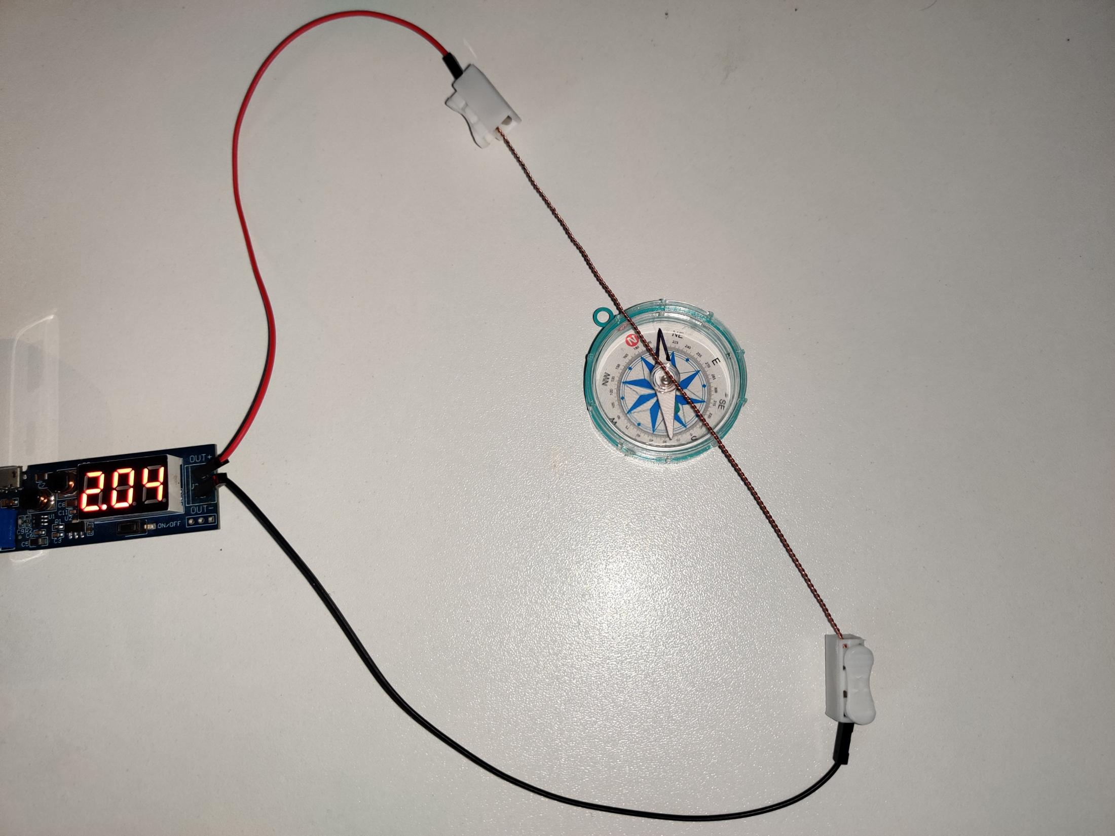 Підключити джерело живлення 2В і мідний дріт в якості провідника. Провідник тримати одразу над стрілкою компаса в сторону півночі. Увімкнути на 30 секунд джерело живлення. Побачити реакцію і вимкнути.