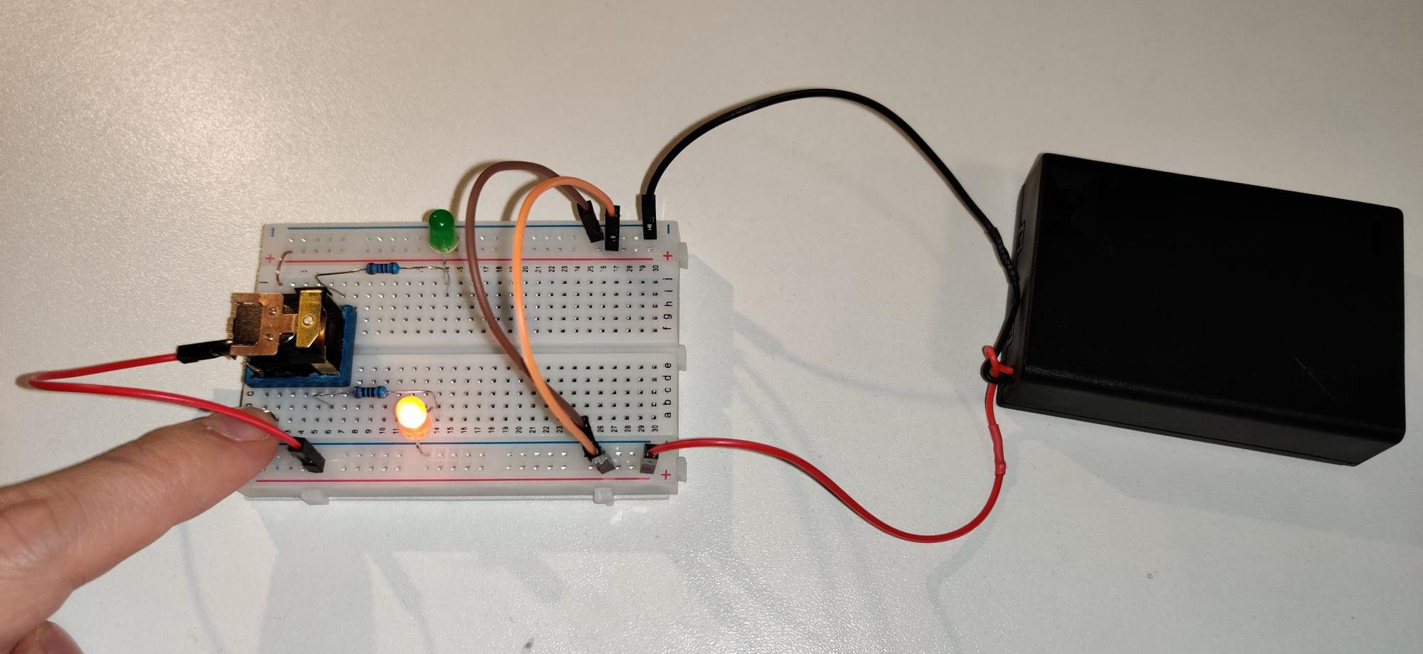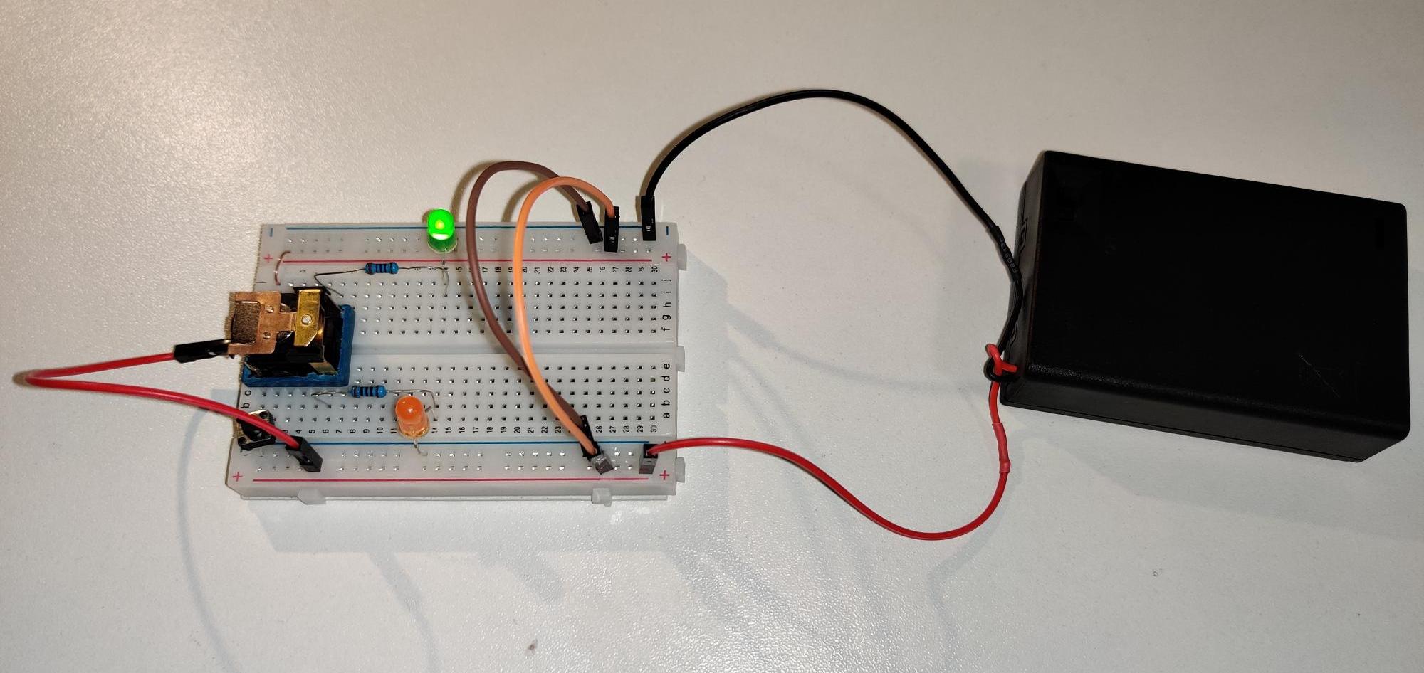 Підключіть живлення 3-4 В до демонстраційного стенду. За замовчуванням "якір" замикає одне електричне коло з одним світлодіодом. Якщо натиснути кнопку, то спрацює електромагніт (котушка дроту з осердям) всередині реле і "якір" притягнеться донизу і замкне інше електричне коло - вже з іншим світлодіодом, від чого той засвітиться. Відповідно попереднє електричне коло з першим світлодіодом розімкнеться.