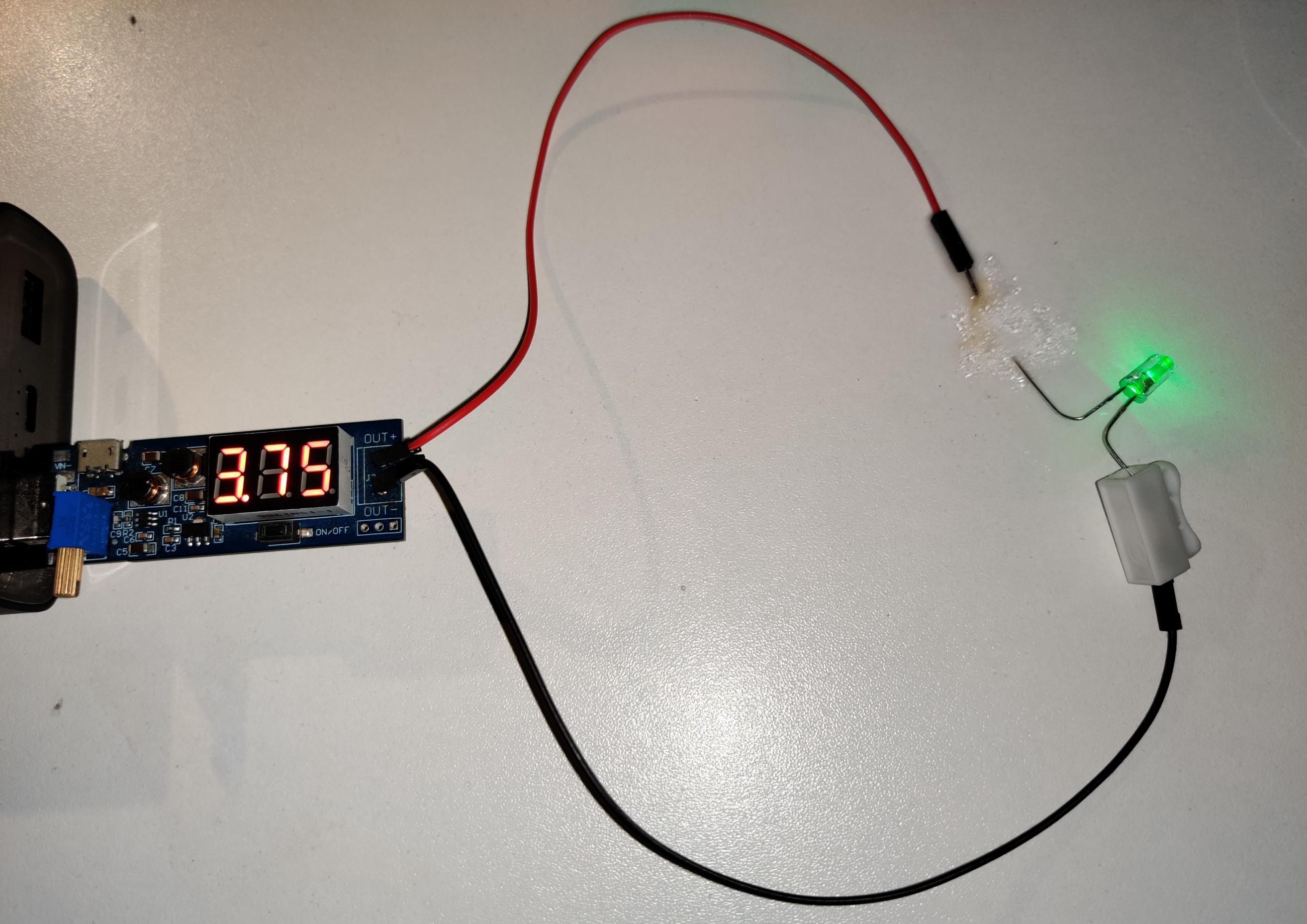 Під'єднуємо послідовно джерело живлення 3В, пляму води і світлодіод (пам'ятаємо про полярність світлодіоду). Як бачимо, світлодіод не світиться або ледь світиться. Тепер підсолюємо пляму води більше і більше. Тепер світлодіод світиться яскраво.